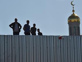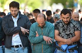 Мусульманский праздник Ураза-Байрам. Верующие во время намаза у Московской Соборной мечети.