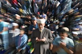 Мусульманский праздник Ураза-Байрам. Верующие во время намаза у Исторической мечети.