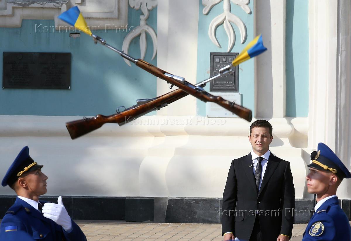 Президент Украины Владимир Зеленский (второй справа) во время церемонии торжественного поднятие…