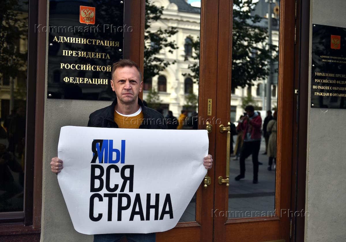 One-person protests in front of Presidential Executive Office in support of Pavel Ustinov, an actor…