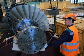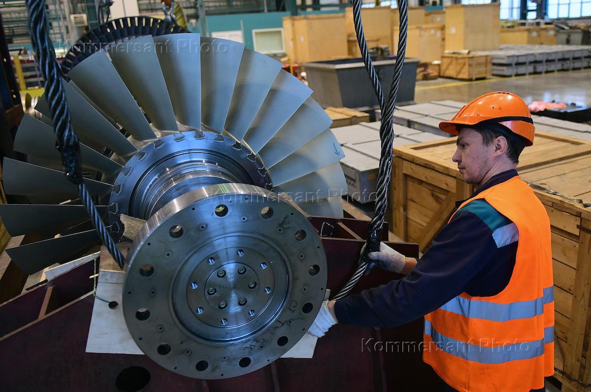 Сотрудник компании "Силовые машины" крепит трос на газовой турбине ГТЭ-65 для транспортировки на…