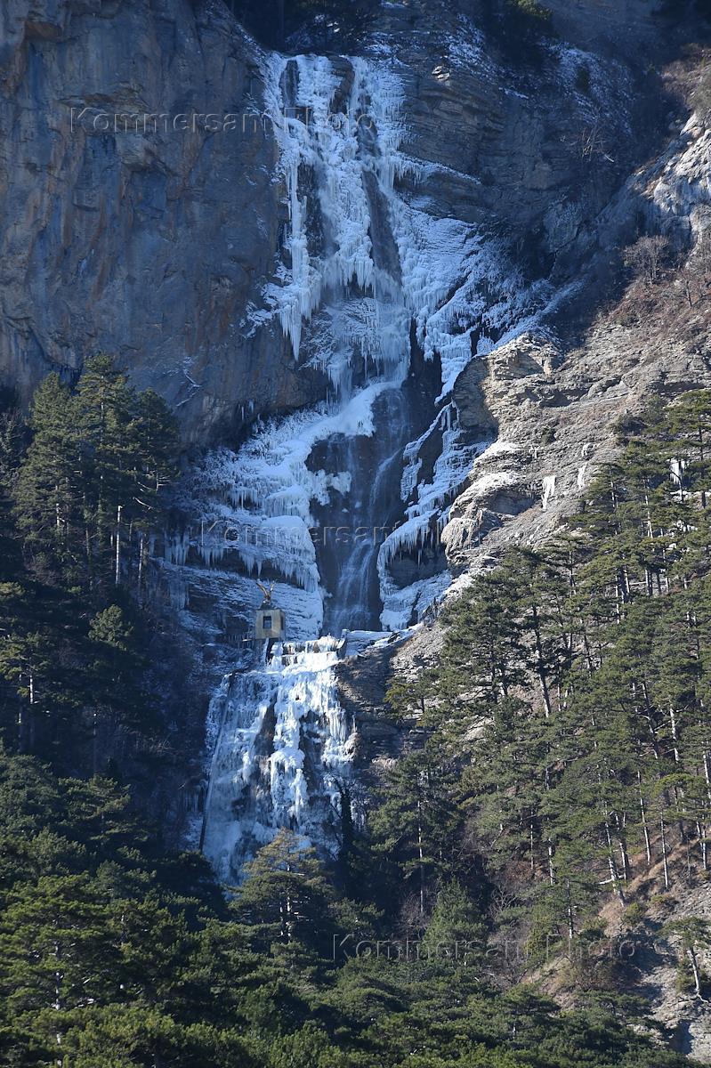 Genre photo. 100-meter Uchan-Su waterfall frozen over due to a cold snap.