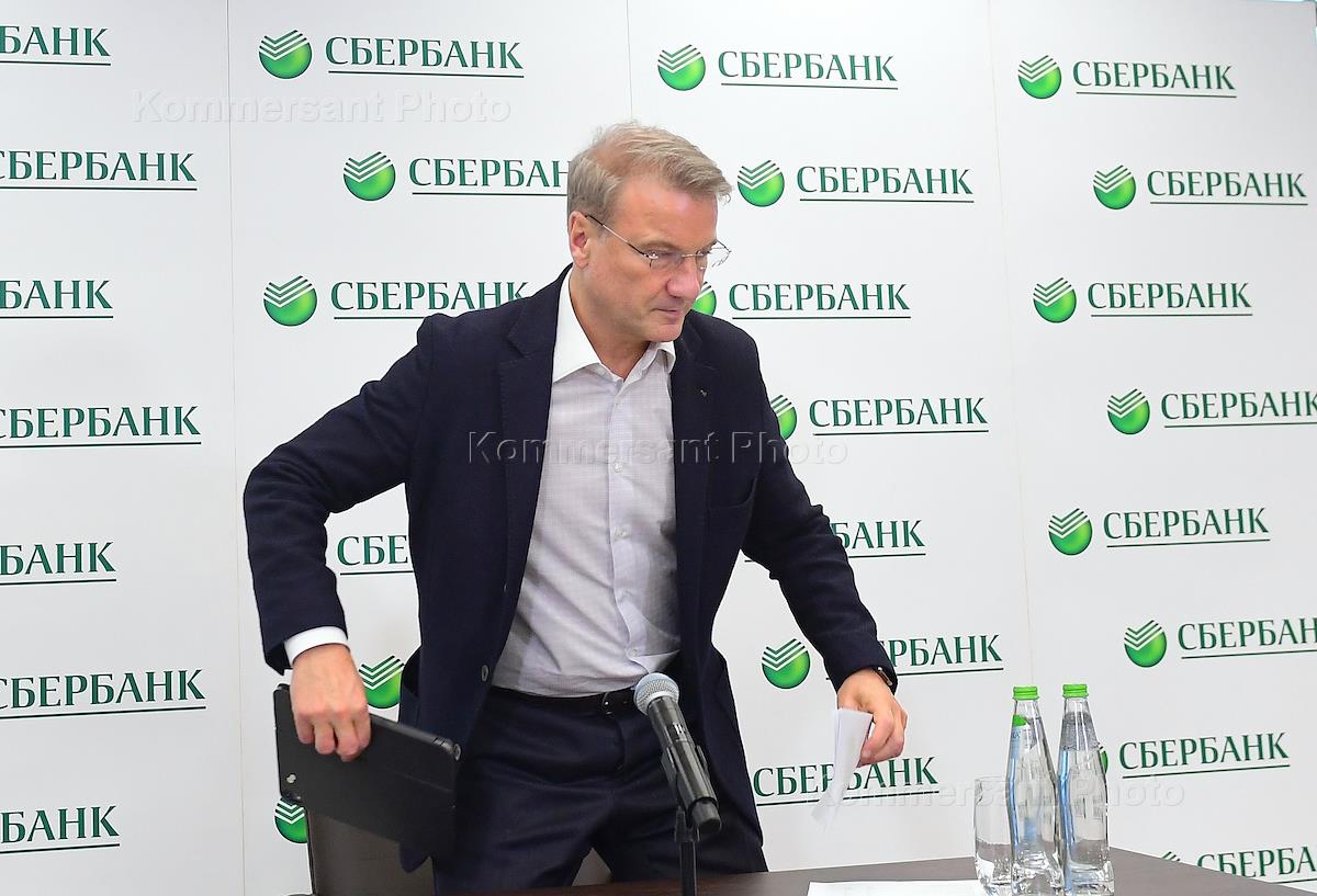 President, Chairman of the Board of Sberbank Herman Gref arrives for the press conference after the…