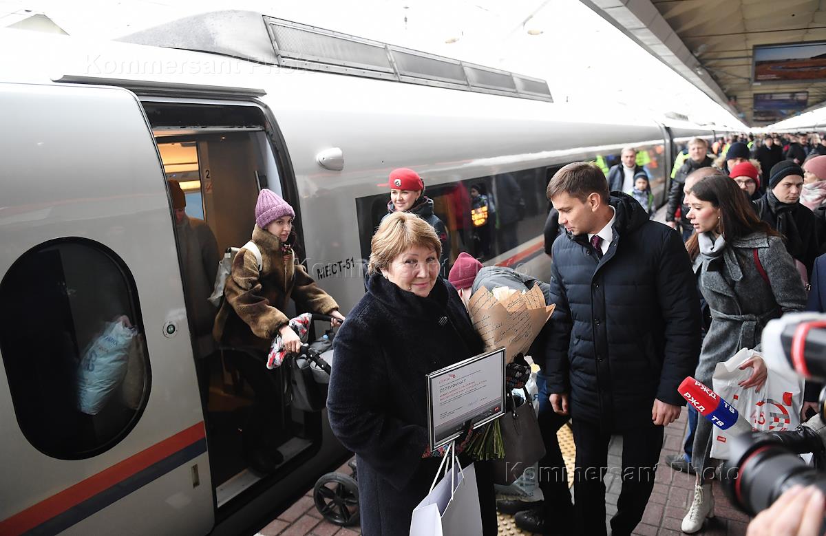 Церемония встречи 40-миллионного пассажира высокоскоростного поезда "Сапсан" на Ленинградском…
