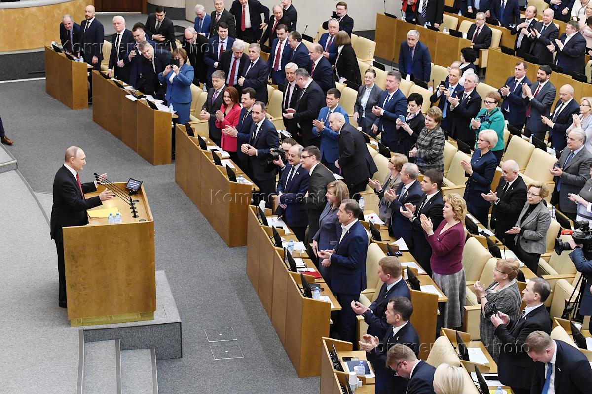 Пленарное заседание Государственной думы (ГД) России. Президент России Владимир Путин (слева) во…