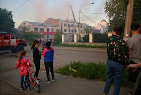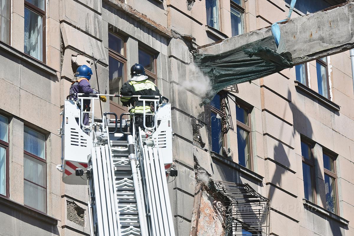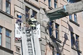 Emergency service officers extinguish fire in an abandoned building on the Culture Boulevard.