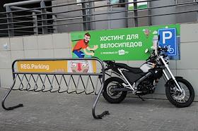 Жанровая фотография. Мотоцикл на парковке для велосипедов у торгового центре.