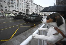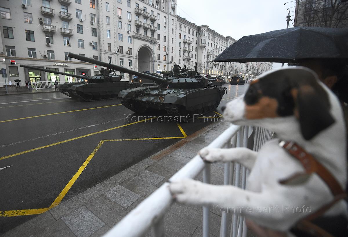 Ночная репетиция Парада Победы на Красной площади. Проход военной техники по Тверской улице.