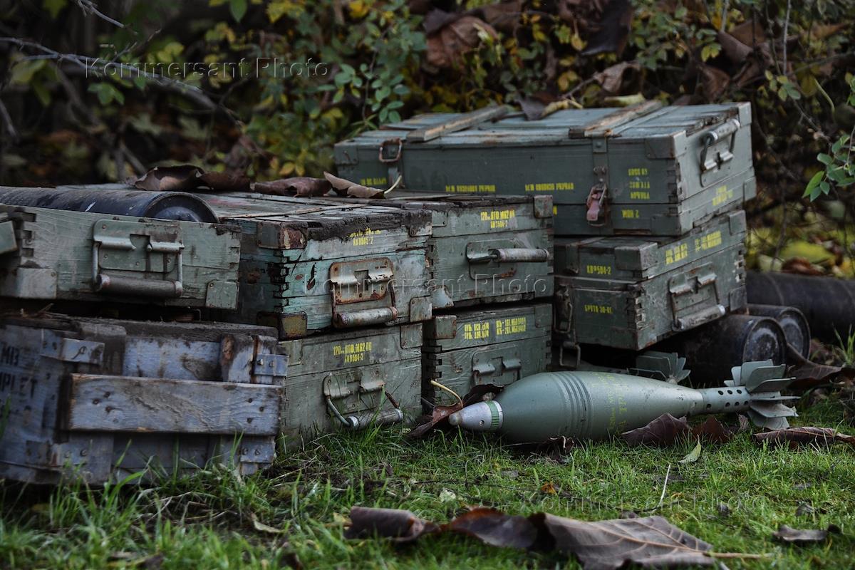 Азербайджан после завершения военного конфликта вокруг Нагорного Карабаха. Ящики со снарядами на…