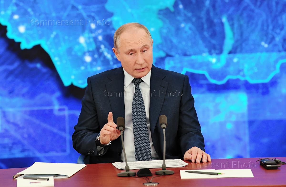 Russian President Vladimir Putin during an annual press conference at the Novo-Ogaryovo residence in…