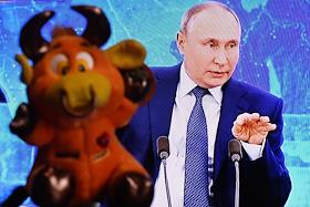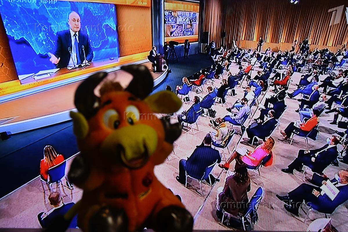 Жанровая фотография. Трансляция ежегодной пресс-конференции президента России Владимира Путина.