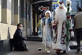 Виды Ялты. Жанровая фотография. Дед Мороз и Снегурочка гуляют по городской улице.