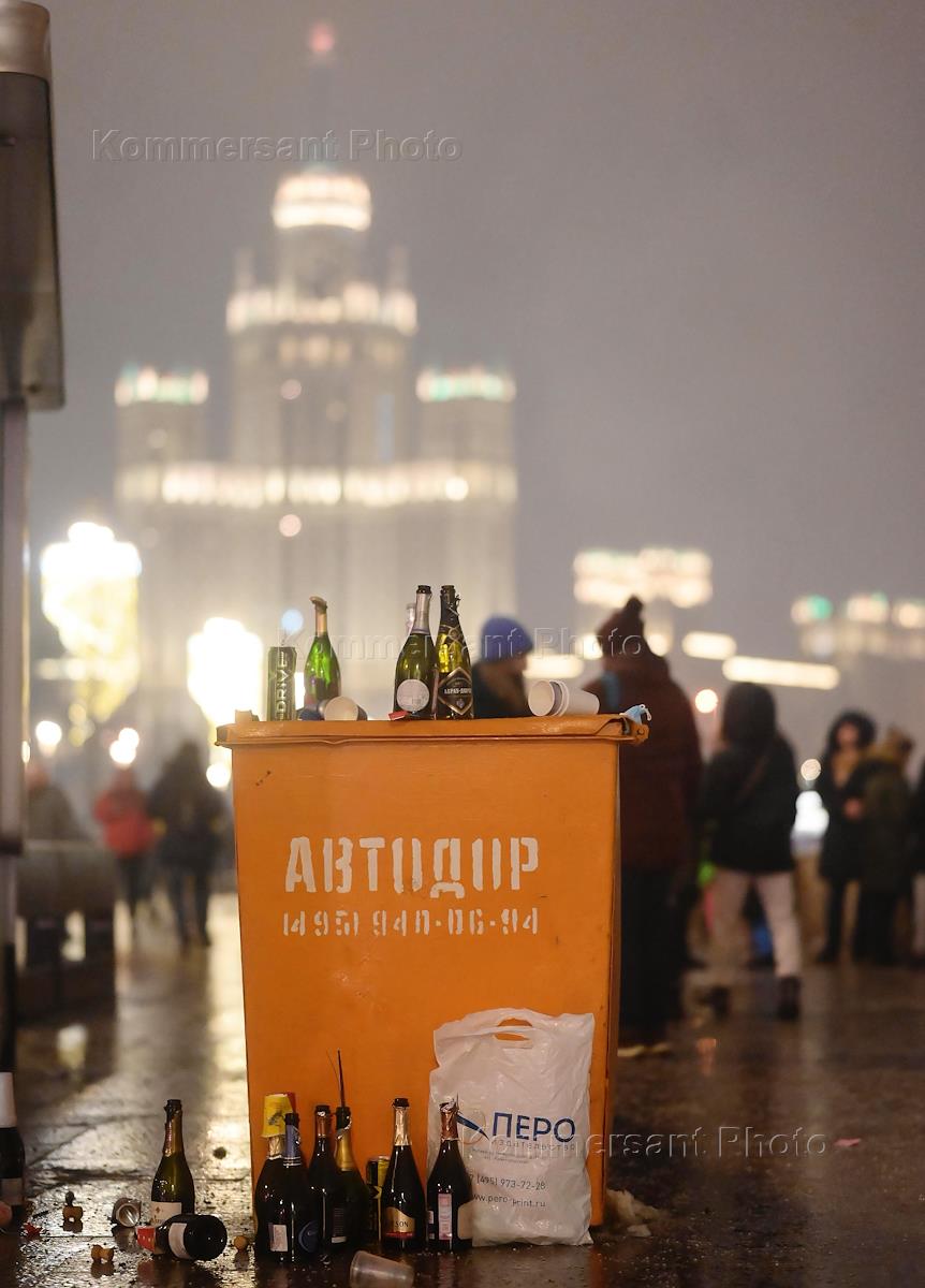 Жанровая фотография. Празднование нового года на улицах города. Пустые бутылки шампанского в сквере…
