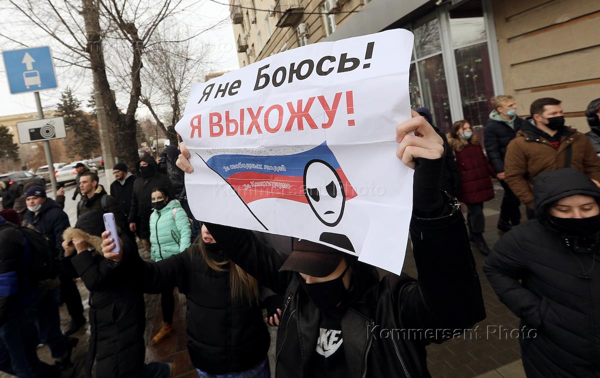 Митинг в поддержку политика Алексея Навального. Участники во время митинга. участник митинга держит…