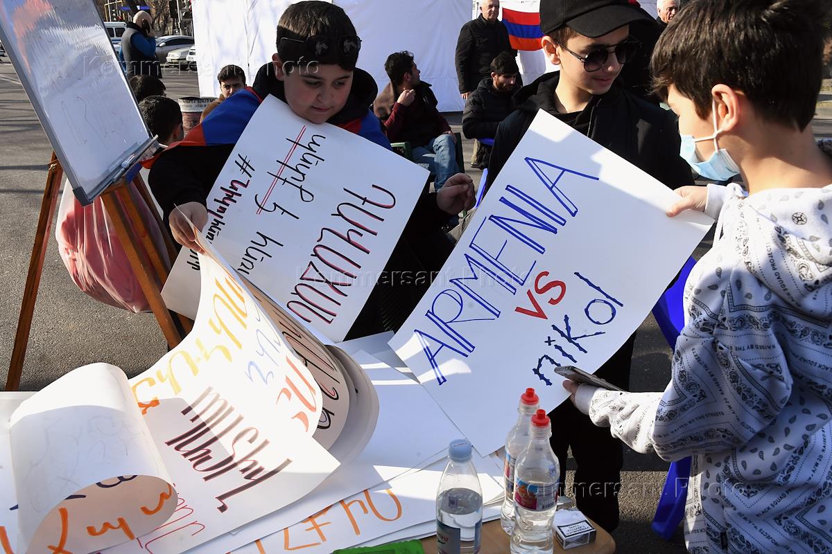 Политическая ситуация в Ереване. Дети рассматривают агитационные плакаты после шествия оппозиции.