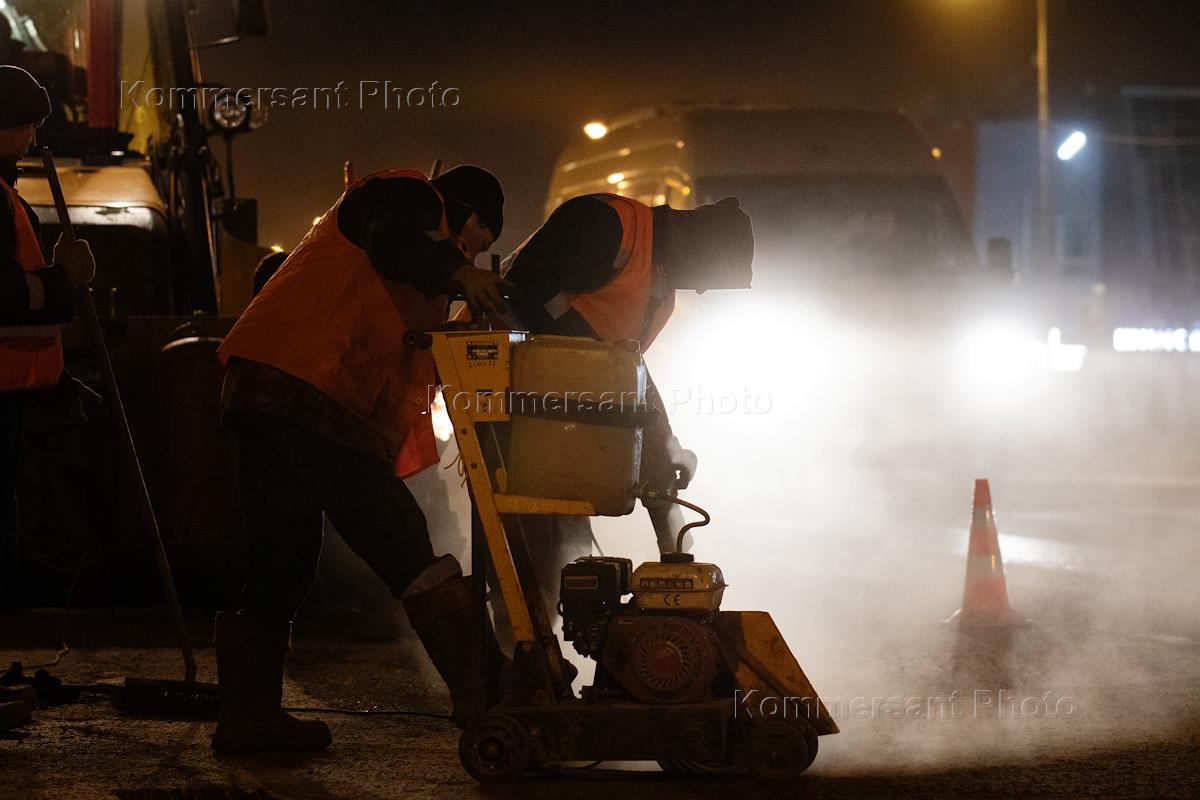 Жанровая фотография. Дорожные рабочие во время ремонтных работ на дороге.