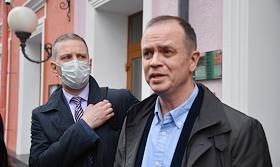 Адвокат Иван Павлов (в центре), обвиняемый в разглашении данных предварительного следствия, у здания…