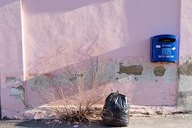 Жанровая фотография. Ящик для писем и мусорный пакет у стены.