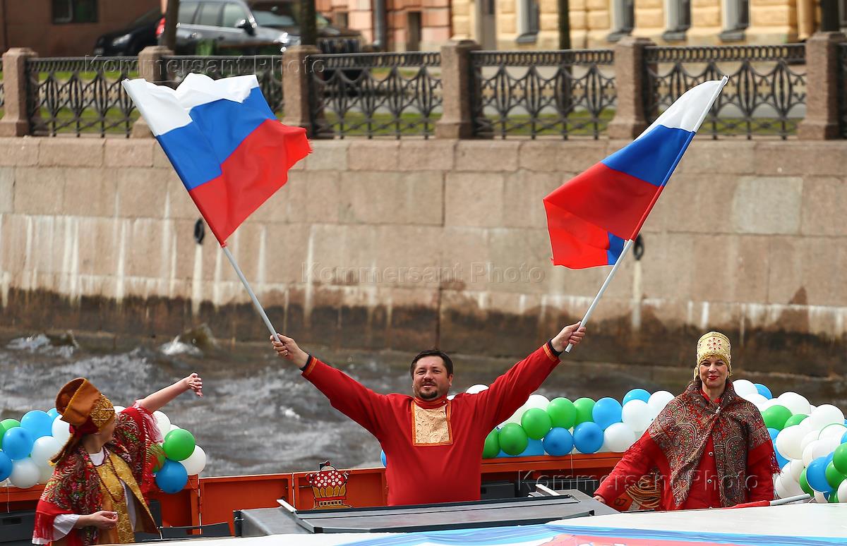 Участники речного карнавала, посвященного открытию туристического сезона в Санкт-Петербурге.…