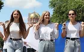 День России. Праздничные мероприятия в Волгограде. Флешмоб "Флаг России". Участники флешмоба на…