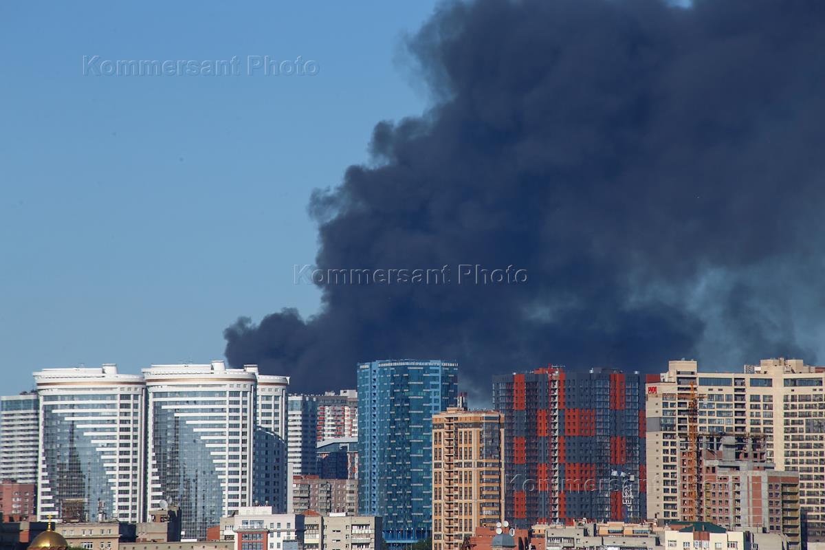 Горящая автозаправочная станция (АЗС). Вид на клубы дыма с другого конца города.