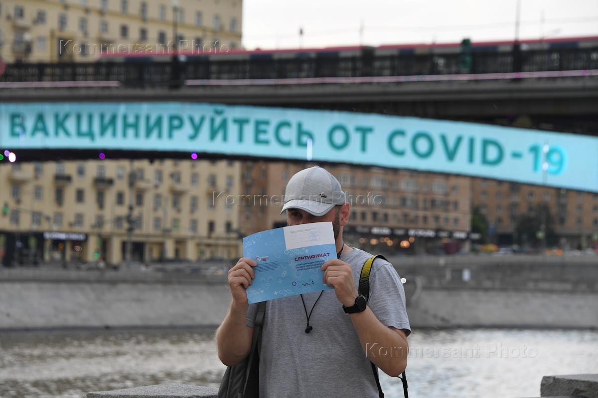 Виды Москвы. Жанровая фотография. Сертификат о вакцинации против covid-19 в руках у мужчины на фоне…