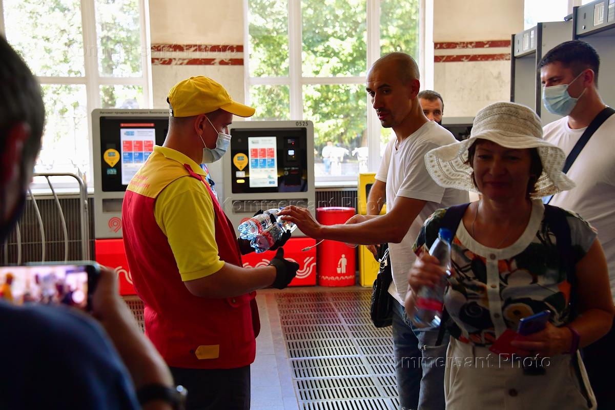 Сотрудники Московского метрополитена во время раздачи бутилированной воды пассажирам на станциях…