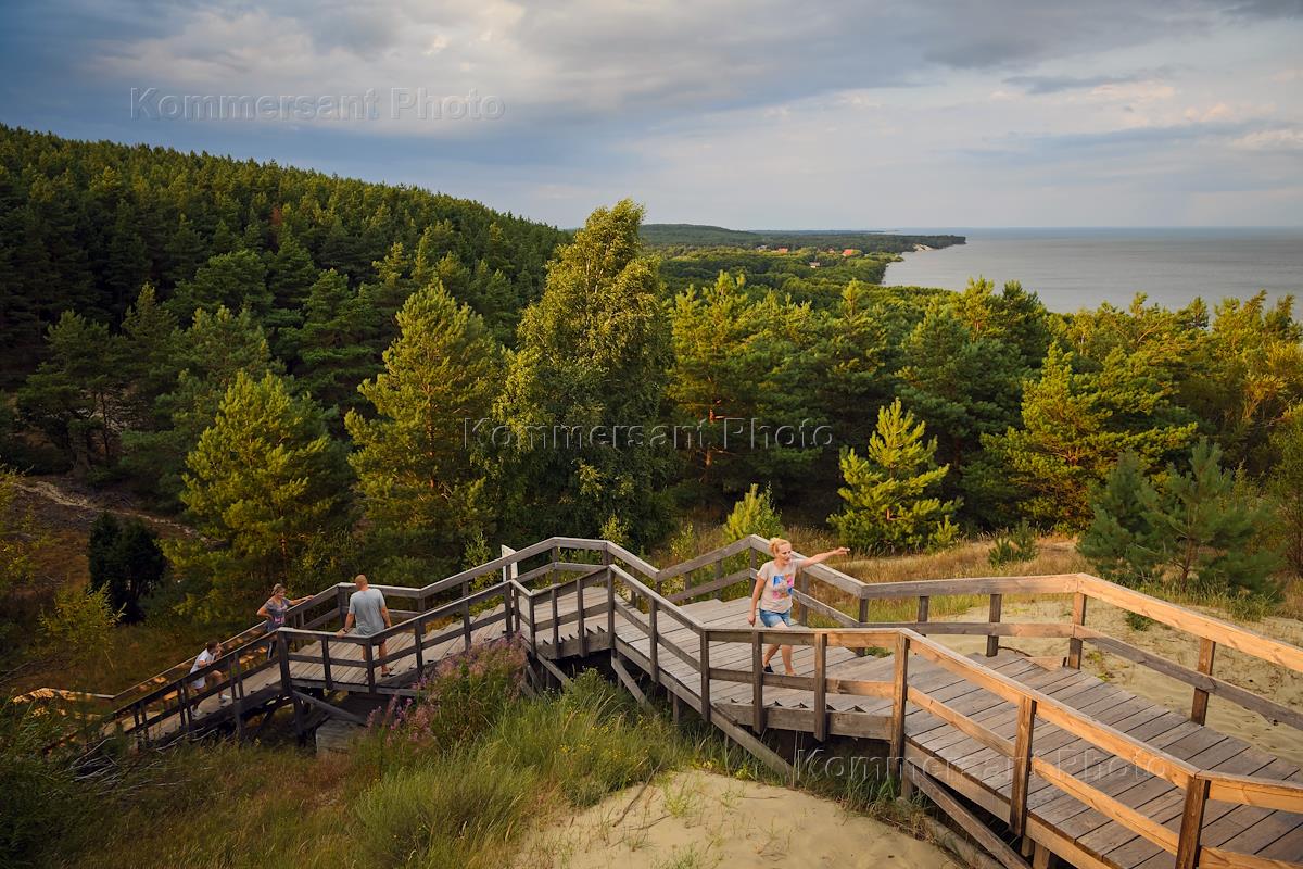 Виды Куршской Косы. Люди гуляют по деревянным дорожкам.