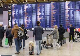 Жанровая фотография. Пассажиры у информационного табло вылета и прилета в международном аэропорту…