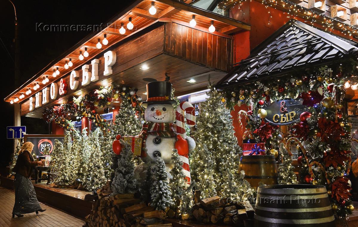Виды Ялты. Жанровая фотография. Новогоднее оформление города. Павильон на новогодней ярмарке на…