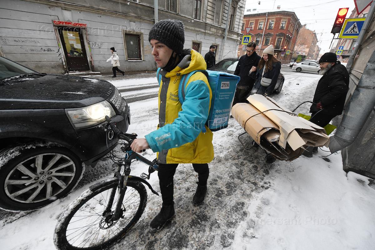 Снег в Санкт-Петербурге. Жанровая фотография. Курьер службы доставки еды с велосипедом на не…