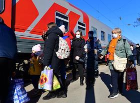 Встреча первого поезда с беженцами из Донецкой народной республики (ДНР) на железнодорожном вокзале…