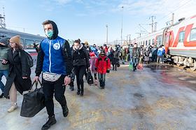 Встреча первого поезда с беженцами из Донецкой народной республики (ДНР) на железнодорожном вокзале…