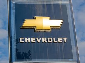 Жанровая фотография. Стойка с эмблемой Chevrolet возле автосалона компании "Автомир".