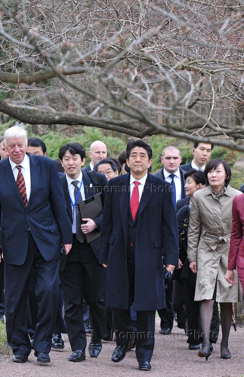Премьер-министр Японии Синдзо Абэ (в центре) с супругой Аки Абэ (справа) во время посещения Японский…