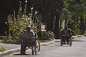 Ситуация в Мариуполе. Жанровая фотография. Мужчины в инвалидных колясках едут по дороге.