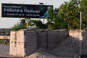 Ситуация в Херсонской области. Жанровая фотография. Рекламный плакат "Работа в Польше" на обочине…