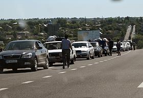Ситуация в Мариуполе. Жанровая фотография. Колонна автомобилей, уезжающих на Украину, на границе ДНР.