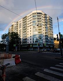 Views of St. Petersburg. Genre photography. Rainbow over a multi-storey residential building.