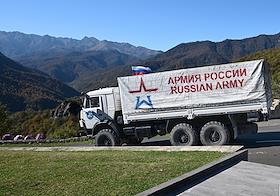 Views of Nagorno-Karabakh. Genre photography. Truck "Army of Russia" while driving on the road.