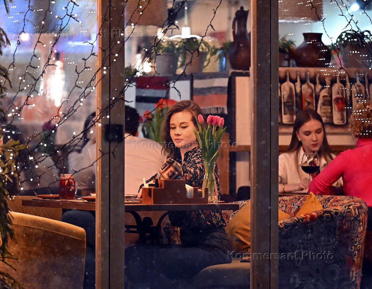 Празднование Международного женского дня на Патриарших прудах. Жанровая фотография. Девушка в кафе с…