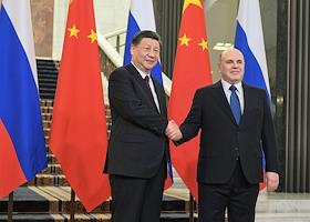 Председатель правительства России Михаил Мишустин (справа) и председатель КНР Си Цзиньпин (слева) во…