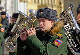 Репетиция сводного военного оркестра к Параду Победы на Дворцовой площади.