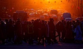 Жанровая фотография. Пешеходы переходят Невский проспект во время заката солнца.
