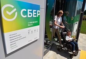 Сбербанк открыл первый офис в Севастополе. Жанровая фотография. Женщина с ребенком выходит из офиса…