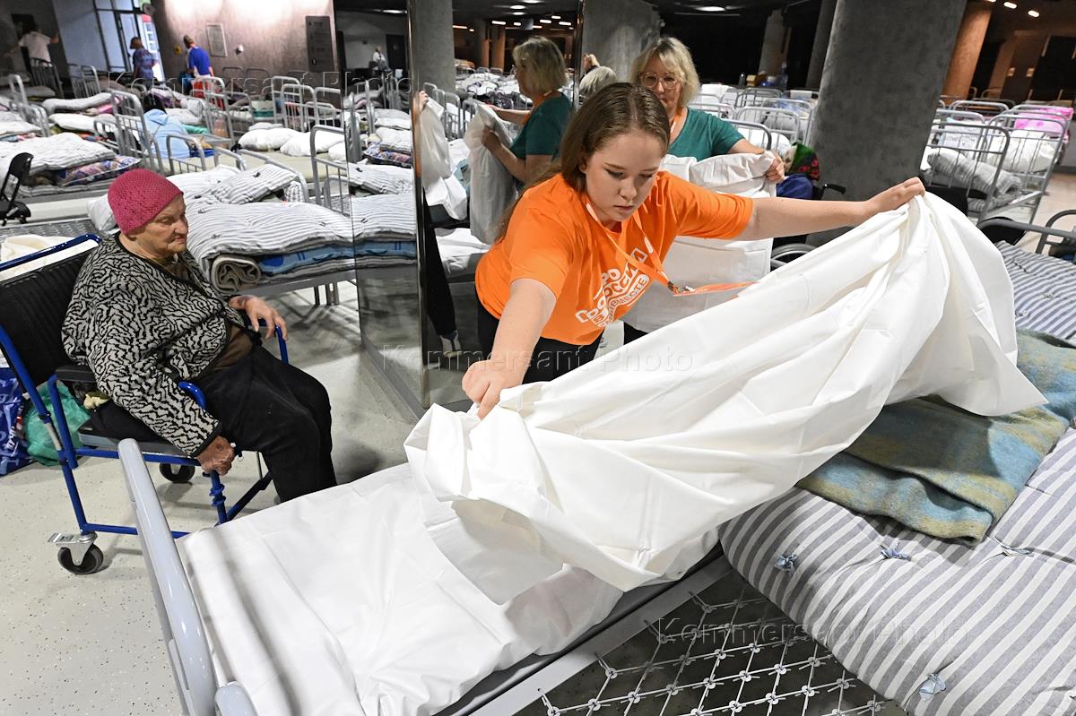 Пункт временного размещения (ПВР) в спорткомплексе "Белгород-Арена", где размещены выехавшие из…