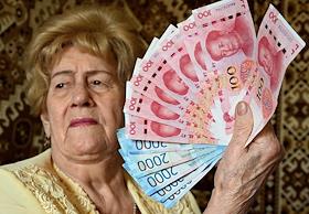 Жанровая фотография. Пожилая женщина держит в руке купюры российских рублей и китайских юаней веером.