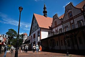 Виды Светлогорска во время туристического сезона. Жанровая фотография. Туристы на улице города.