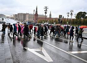 Жанровая фотография. Дождь в городе. Люди под зонтами переходят по пешеходному переходу на…