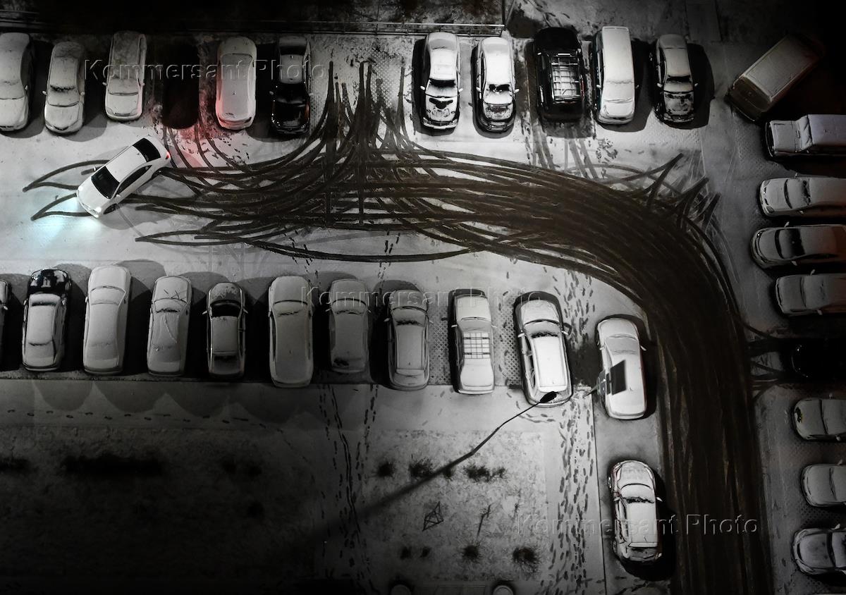 Views of Omsk during snowfall. Genre photography. Cars covered with snow in a parking lot in the…